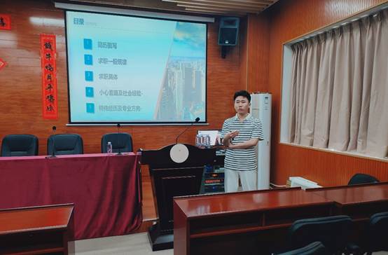 接下来颜坤喜同学为大家分享了自己专业对口的岗位求职经验,主要从简历撰写、求职一般规律、求职渠道和时间、招聘套路、社会经验、特殊经历及专业就业方向等方面进行了分享。颜同学的讲解平易近人、通俗易懂,对缺乏求职经验或打算就所学专业就业的学生很有帮助。