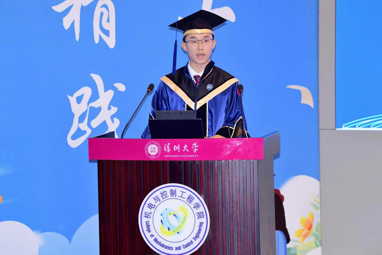 随着庄严的国歌声响起,毕业典礼正式拉开帷幕。学院优秀毕业生代表本科生陈星宇和硕士生谢岩松分别发言。陈星宇深情地回顾了大学四年的点点滴滴,从初入校园时的青涩懵懂到如今的成熟自信,每一步都凝聚着汗水与努力。他特别感谢了 RobotPilots 机器人实验室,表示正是 RobotPilots 的经历让他不断挑战极限,突破自我,收获成长。他鼓励所有同学在以后都能够“坦诚,极致,志远,忘我,不功利”,怀揣梦想,继续前行。谢岩松回顾了自己在科研道路上的探索与发现,感谢学院提供的良好科研环境和导师的悉心指导,也感谢同学们的相互支持与鼓励。他呼吁全体同学将所学知识与技能应用于实践,时刻保持严谨认真,脚踏实地,保持初心。下一个惊天动地的“工业奇迹”,也许就是由各位学子来亲手拧上其中的一颗螺丝。