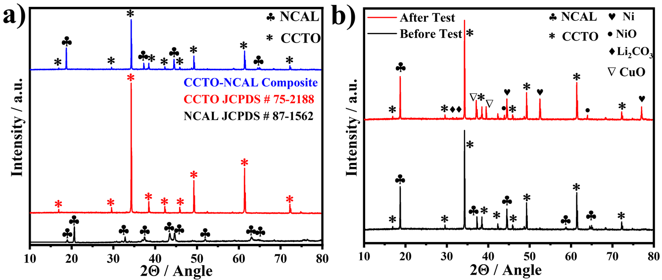 Fig. 2. X-ray diffraction patterns of NCAL, CCTO, and their heterostructure CCTO–NCAL. b X-ray diffraction patterns of CCTO–NCAL heterostructure before and after testing in fuel cell operation