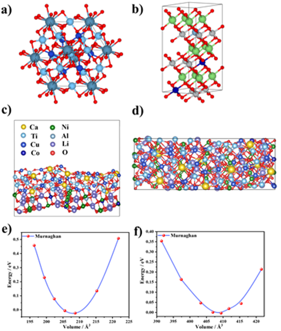 Fig. 1. Optimal and relaxed crystal structures of CCTO and NCAL. c, d Top and side view of the CCTO–NCAL heterostructure crystal structures and e, f calculated values of energy vs volume of CCTO and NCAL via Murnaghan method.
