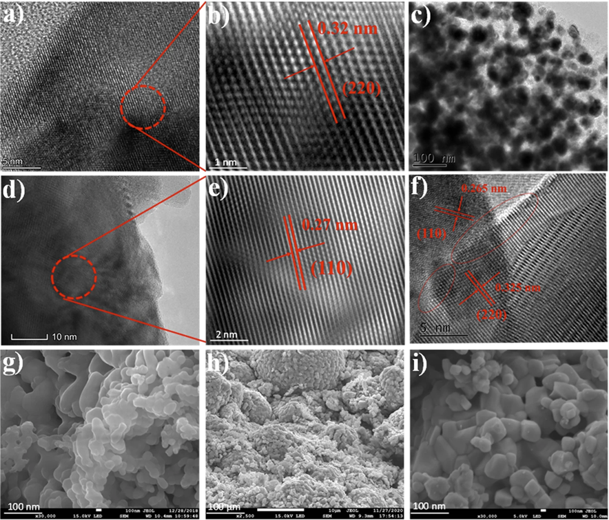 Fig. 3. a-f High-resolution transmission electron microscope images representing the microstructure included the calculated lattice spacing and particle distribution with hetero-interfaces at the particles-level of CCTO, NCAL, and CCTO–NCAL heterostructure. g–i Field emission-scanning electron microscopy images depicting: the surface morphology and particles distribution of the CCTO, NCAL, and CCTO–NCAL heterostructure.