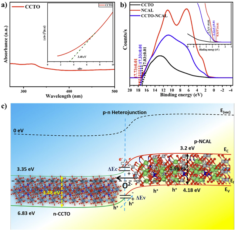 Fig. 5. a UV–Vis spectra of CCTO, complete spectrum and energy optical gap. b UPS spectra cutoff energy region, and onset energy region of CCTO, NCAL, and CCTO–NCAL. c Energy band diagram of fuel cell CCTO–NCAL heterostructure obtained according to UPS results and energy band gap.