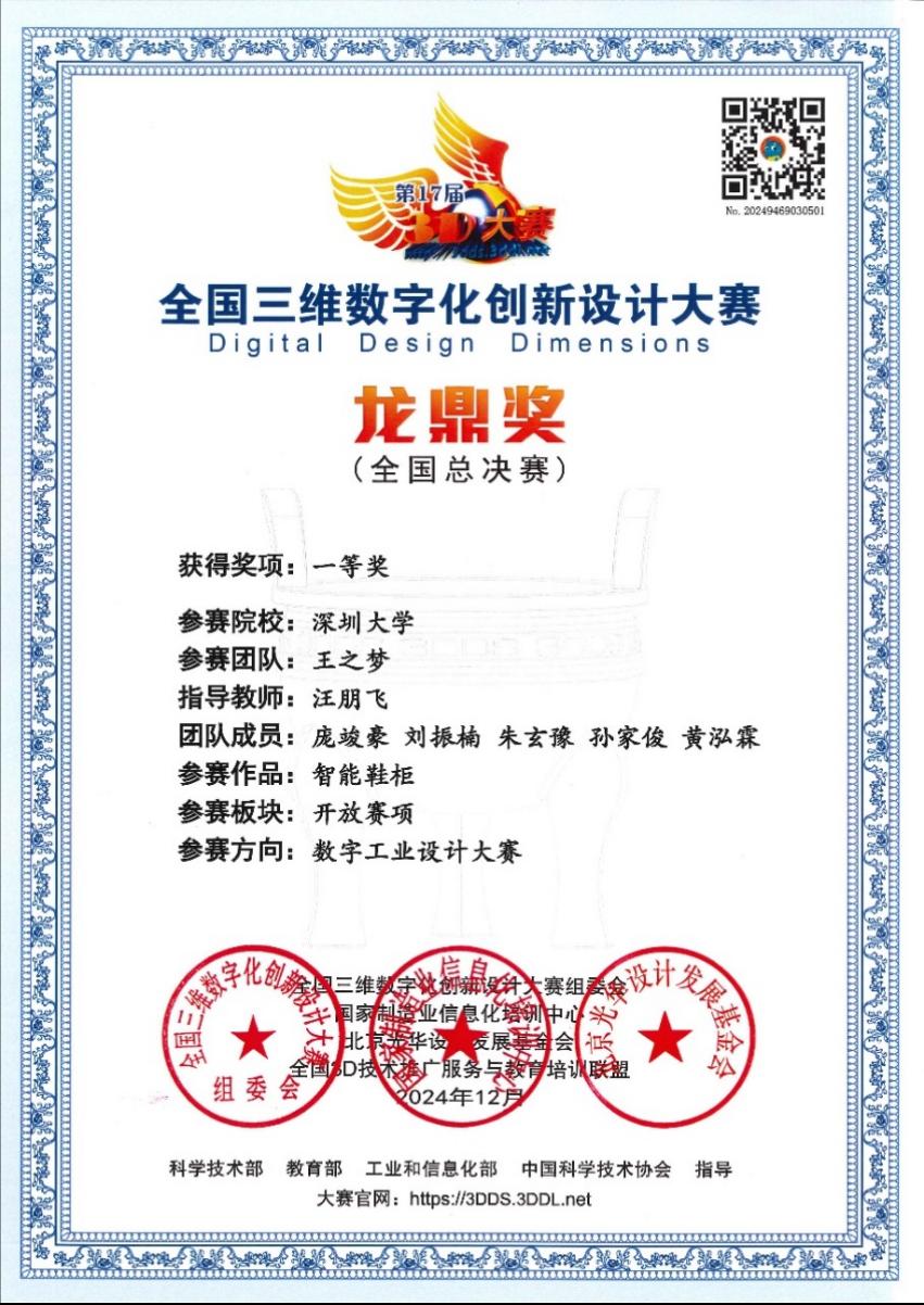 本科生“王之梦”队(作品名称:智能鞋柜,成员:庞竣豪、刘振楠、朱玄豫、孙家俊和黄泓霖),在汪朋飞老师的指导下,稳扎稳打,准备充分,发挥出色,最终获得全国一等奖的优异成绩。
