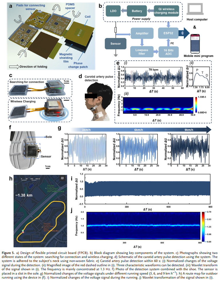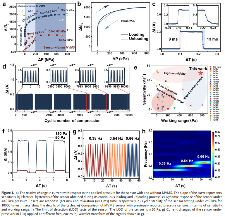 该传感器具有58.88 kPa⁻¹的高灵敏度、50 Pa至782.5 kPa的超宽工作范围、9 ms的快速响应时间以及优异耐久性(在250 kPa压力下循环10,000次)。这种柔性压力传感器还展现出多场景应用的潜力。本文提出的同步压缩机制可为未来高性能柔性传感器的设计提供新思路。