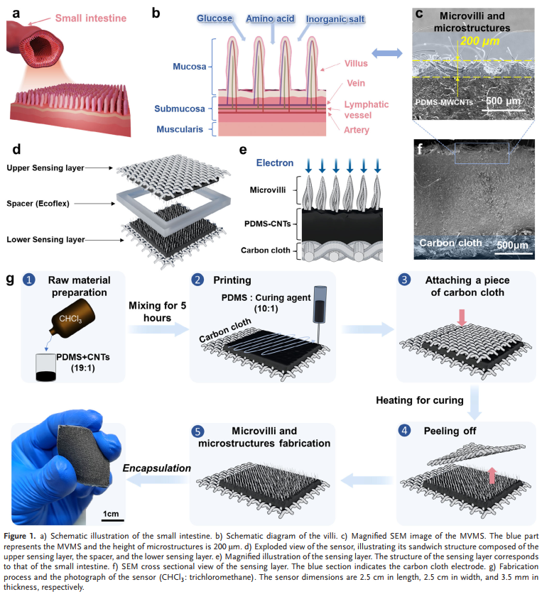 刁东风、张希团队在《ADVANCED FUNCTIONAL MATERIALS》期刊上发表论文(影响因子:18.5),其研究聚焦于一种具备同步压缩机制的超宽量程微绒毛柔性压力传感器的探究,该传感器具备的同步压缩机制可实现超宽范围压力监测。该同步压缩机制包含:(1)微绒毛结构诱导的电子转移增强,(2)微结构接触面积增大,(3)整体压缩时的多壁碳纳米管间距减小。在高压阶段,这些机制协同作用引起电阻变化。因此,该传感器可在半月板模拟的极端高压条件(750 kPa)下检测5 kPa的压力变化(商用传感器在此条件下无法产生响应)。