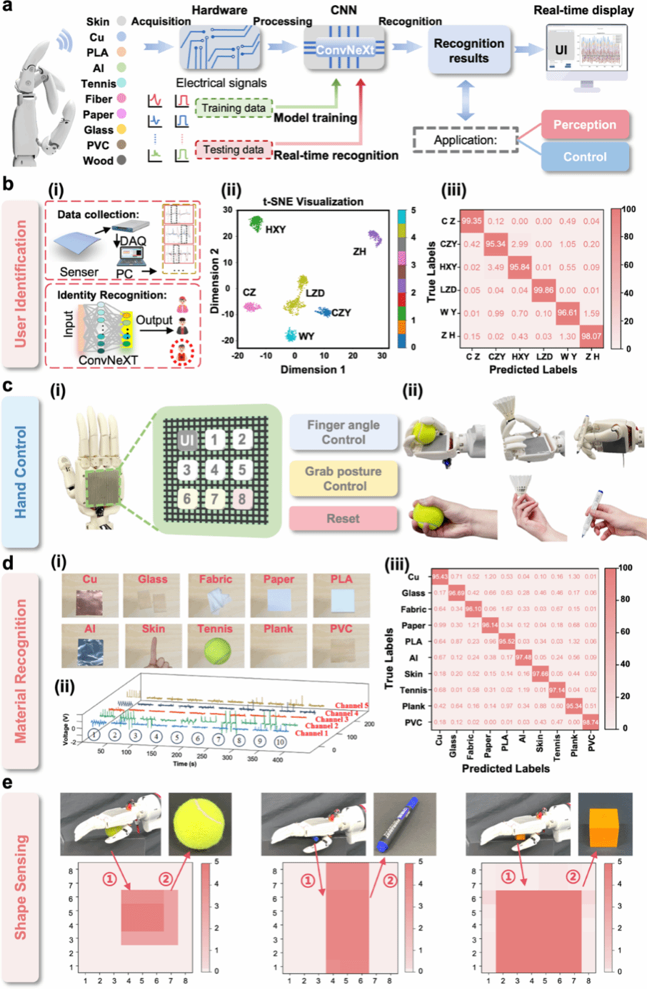 (2)材料识别:指尖集成的传感单元可捕捉不同材料的摩擦电信号特征,对织物、玻璃、塑料等 10 类常见材料的识别准确率达 95% 以上;