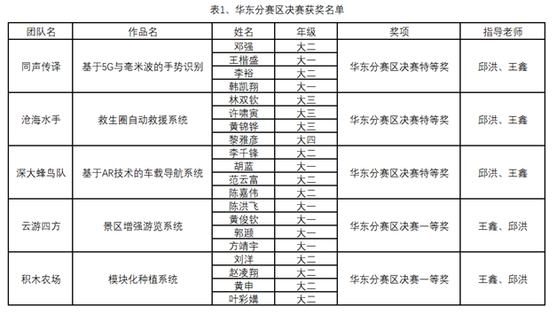 AutoLeaders创新实践俱乐部共组织并指导了六支队伍成功通过初赛进入分赛区决赛,其中共有“沧海水手”五支参赛队伍获奖。且“沧海水手”、“深大蜂鸟队“、”同声传译”三支参赛队伍出线进入全国总决赛。获奖参赛队伍指导老师为邱洪老师和王鑫老师。