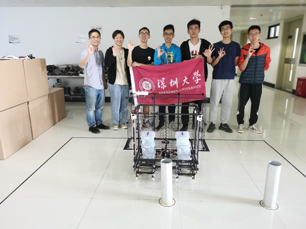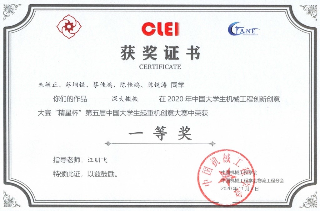 机械专业的朱毓正、苏垌锟、蔡佳鸿和自动化专业的陈佳鸿、陈锐涛等五位同学组成的“深大搬搬”队,在学校教务处和机电学院的大力支持下,在汪朋飞老师的指导下,设计并制造出一款抓取存储一体化智能仓储机器人,完美实现货物的抓取,避障搬运和存储。在线上直播比赛中发挥出色,获得全国一等奖(最高奖项),并以优异的综合成绩获得竞赛组委会推荐参加“中国好设计”创意奖评比。