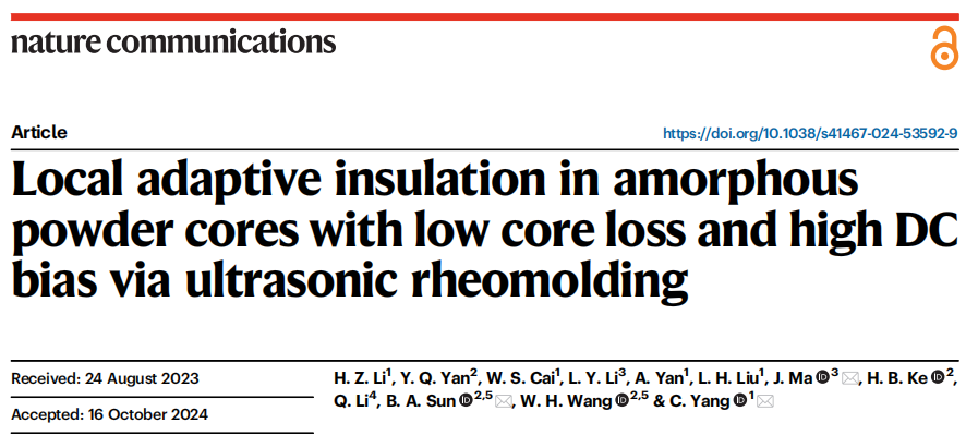 马将教授团队与华南理工大学和松山湖材料实验室等研究团队合作在国际著名期刊《自然·通讯》(Nature Communications)上发表题为“Local adaptive insulation in amorphous powder cores with low core loss and high DC bias via ultrasonic rheomolding”的研究论文。