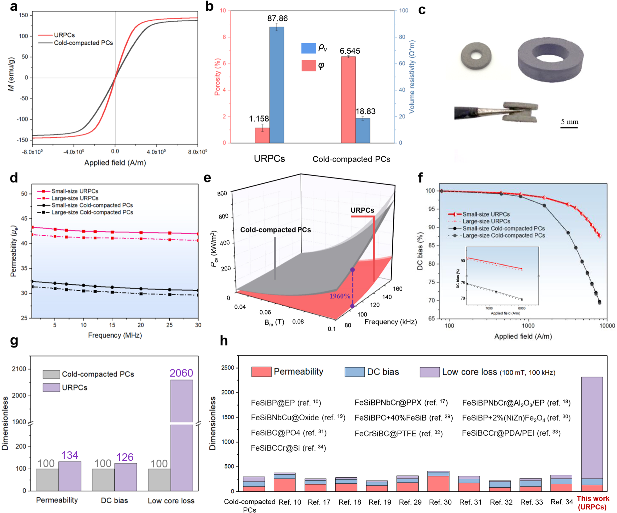 5G通讯作为面向未来移动通讯需求的新一代通讯系统,预计在2030年将带动国内经济总产出超10万亿元。尤其值得关注的是,随着宽禁带半导体器件在电力、电子和电机等5G通讯产品中的广泛应用,小型化、高频低损耗和高电流工作条件对非晶磁粉芯部件的性能指标提出了更严格的要求。然而,非晶磁粉芯面临高孔隙率和内部大量应力残留等瓶颈问题,这些问题显著降低了其磁导率并增加了磁损耗。如何获得低孔隙率、低内应力的高性能非晶磁粉芯,实现其磁导率提升、磁损耗降低且直流偏置同步提升,已成为了行业内亟需的重大挑战。