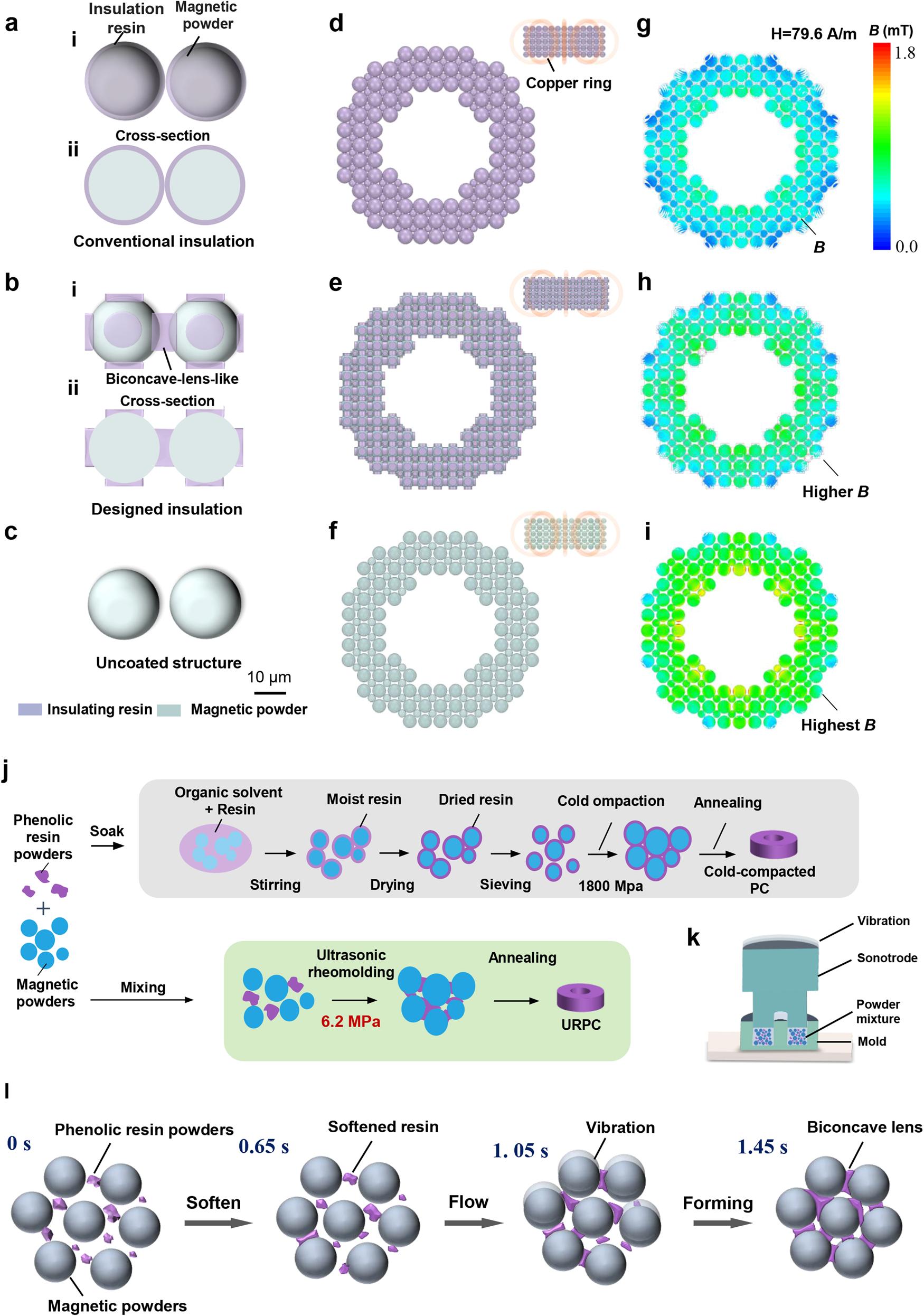 研究人员设计出一种具有双凹透镜结构的自适应绝缘结构(图1),利用团队特色的超声振动加工技术,提升了非晶磁粉的磁化效率,同时协同其低内应力和低孔隙率的积极作用,获得优异的综合软磁性能,有效解决了非晶磁粉芯中高磁导率、低磁损耗、高直流偏置难以兼顾的行业共性难题。
