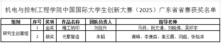 在2025年中国国际大学生创新大赛广东省决赛中,吃瓜 学子表现出色,凭借扎实的专业知识、突出的创新能力和默契的团队协作,斩获1金1银的优异成绩。其中,“精工纳印”项目荣获研究生创意组金奖,“光擎制造”项目获得研究生创意组银奖。