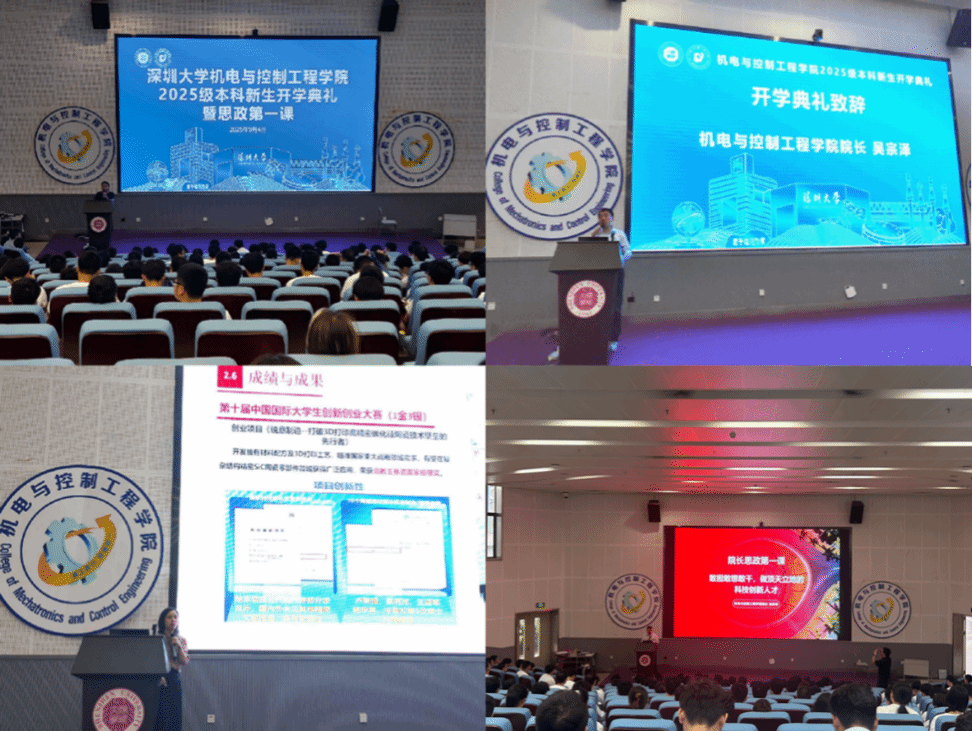 9月4日,开学典礼在致腾楼报告厅隆重举行。院长吴宗泽,党委副书记邓琳、副院长龚峰、钟小品、马将,院长助理张国庆、徐斌,机械系主任赖志慧、自动化系主任陈宏、本科2025级班主任、辅导员、研究生秘书等出席。吴宗泽代表学院致辞并上题为《敢担敢想敢干,做顶天立地的科技创新人才》研究生思政第一课,并公布了2024-2025年度研究生科研奖,同时还讲解了研究生培养相关事宜;娄燕为同学们详细介绍了学院人才培养情况、课程设置及实验教学中心建设情况,并就学习规划、选课安排等注意事项进行了细致说明;党委书记郑纯为本科新生带来思政第一课《青年使命与青春光彩》,与新生共话成长方向。