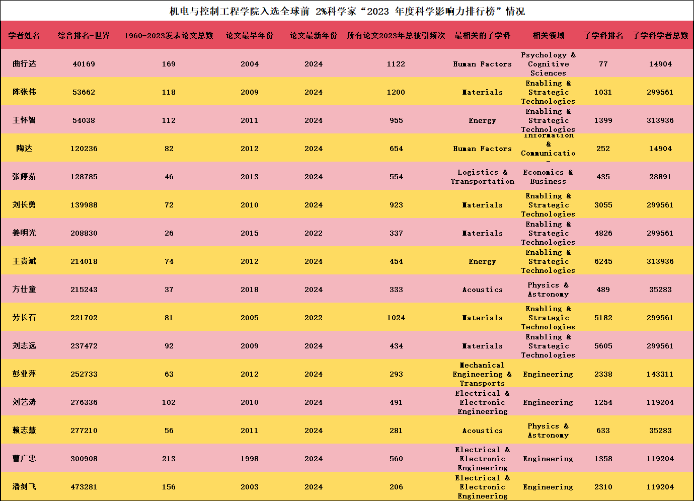 2024916日,美国斯坦福大学John P.A.Ioannidis教授团队发布了全球前2%顶尖科学家榜单第7版,从700多万名科学家中遴选出各领域的世界排名前2%的科学家,覆盖22个领域和174个子学科领域。该榜单分为“终身科学影响力排行榜”(1960—2023)和“2023年度科学影响力排行榜”两个榜单。